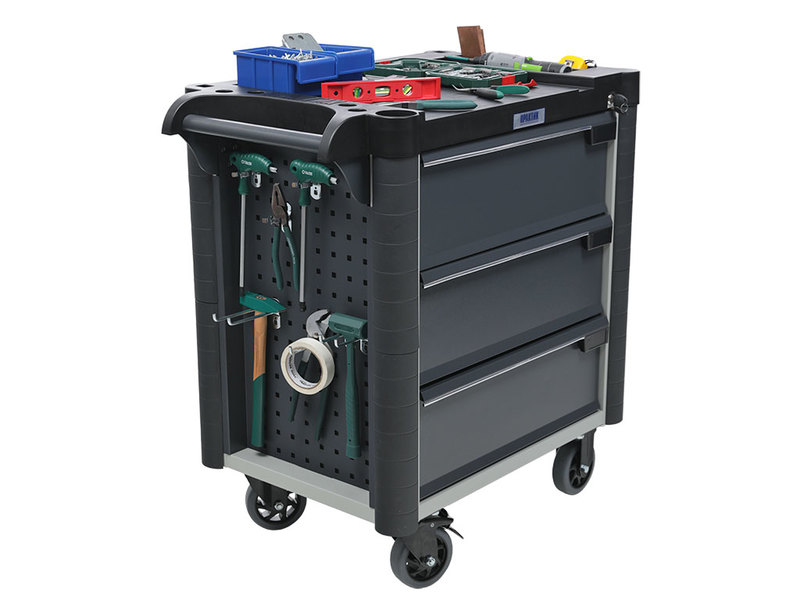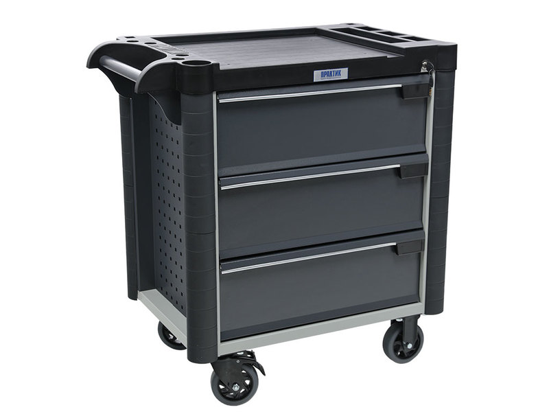 - Топ (пластик черного цвета) оснащён ложементами под инструменты для организации, хранения и удобства использования во время выполнения работ. Нагрузка на ТОП – 30 кг